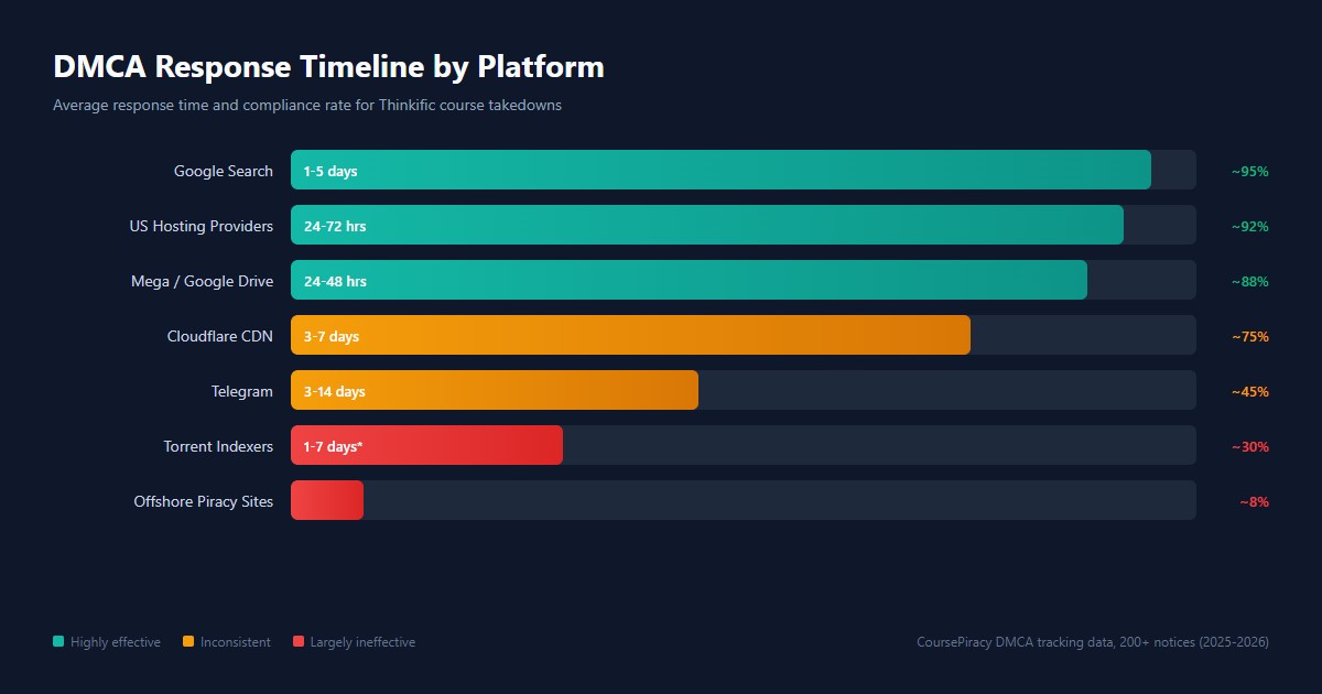 In our experience tracking DMCA outcomes for Kajabi creators, the legal framework works well for US-hosted platforms. The challenge specific to Kajabi piracy is the distribution pattern: Telegram dominates at 40-50% of detected piracy, followed by torrent bundles and file-sharing platforms — each requiring different DMCA approaches.