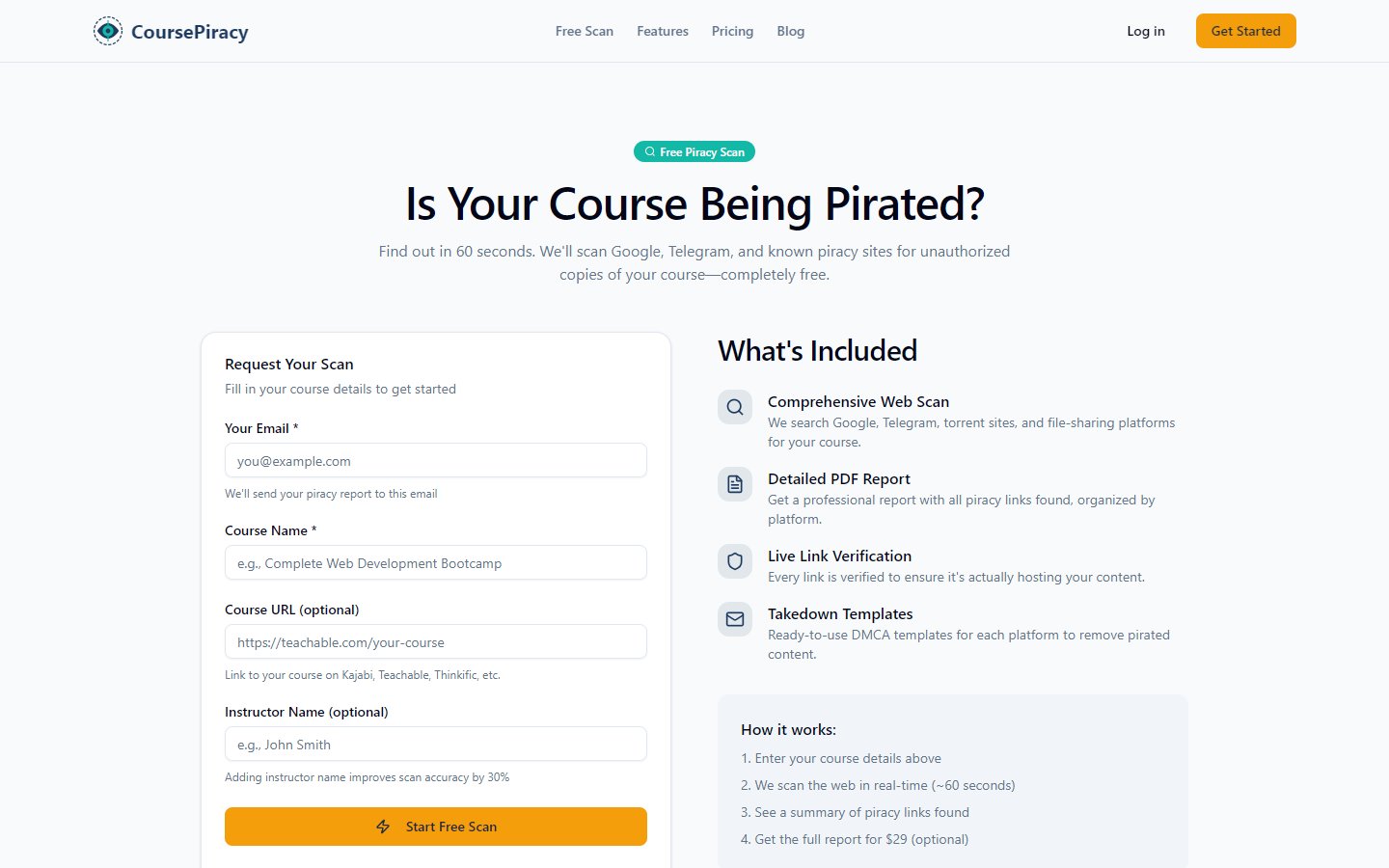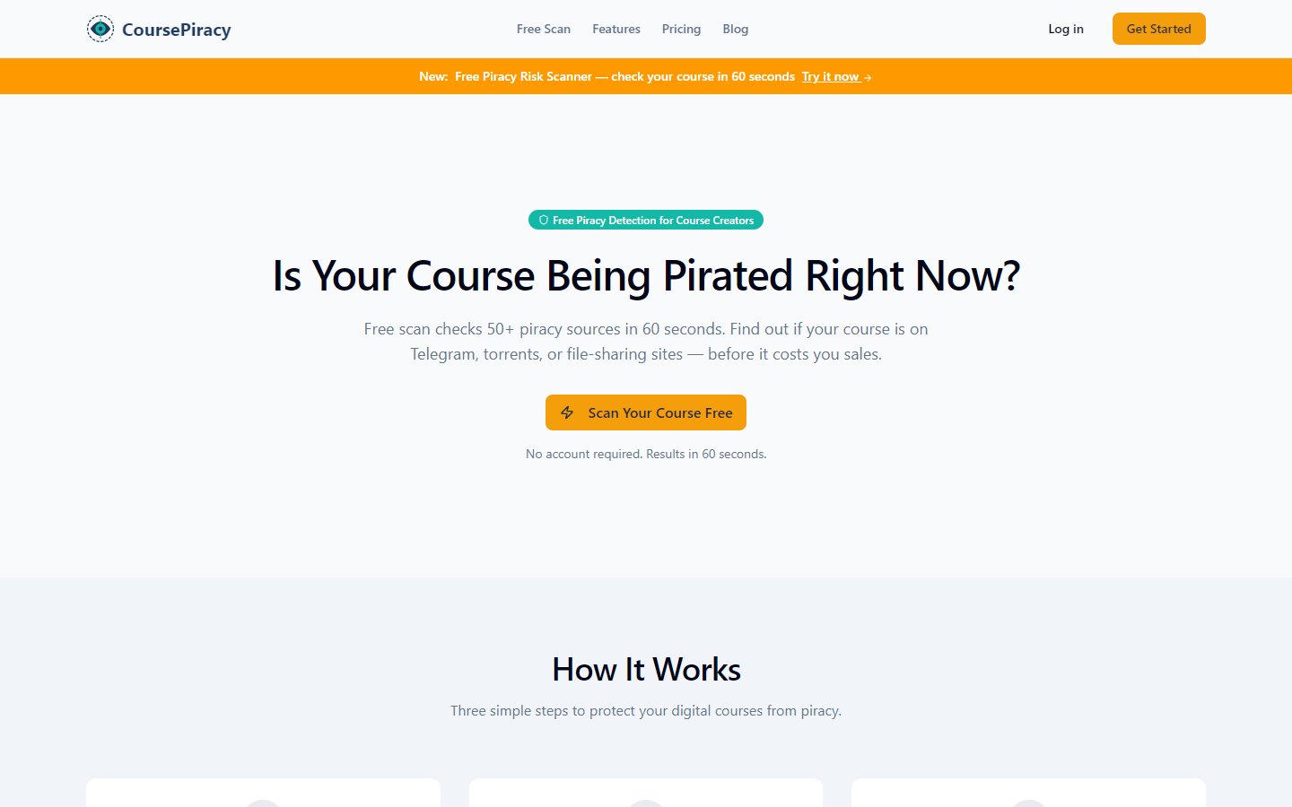 CoursePiracy continuously monitors your products and alerts you when new piracy is detected — before it spreads to additional platforms. Run a free first scan to see the current state of your product's piracy exposure right now.