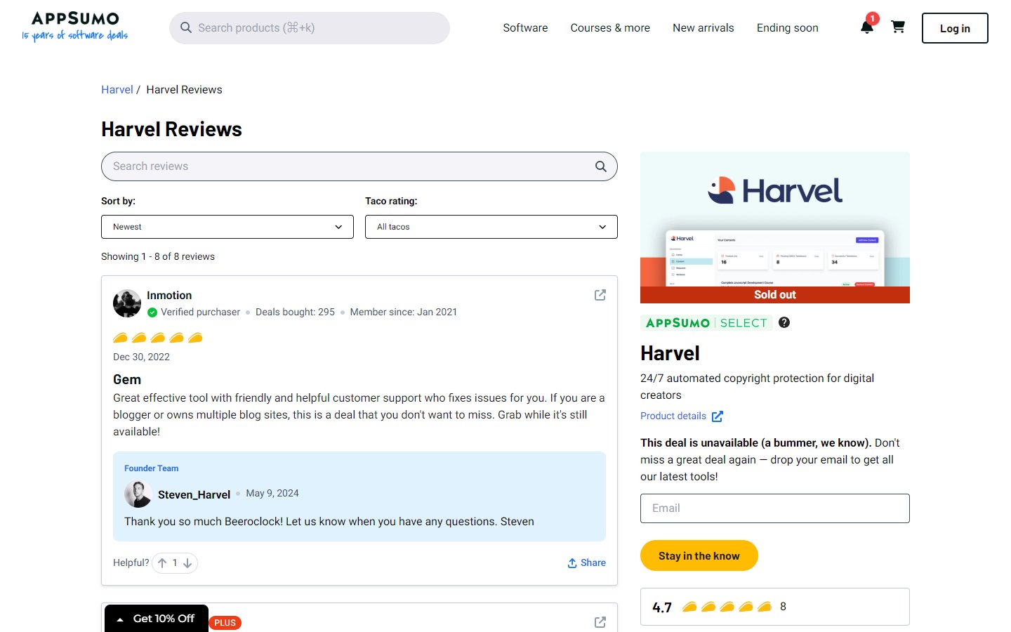 Harvel is a legitimate tool that does what it claims — automated Google de-indexing for pirated content. The 4.7/5 AppSumo rating reflects genuine user satisfaction with its core feature.