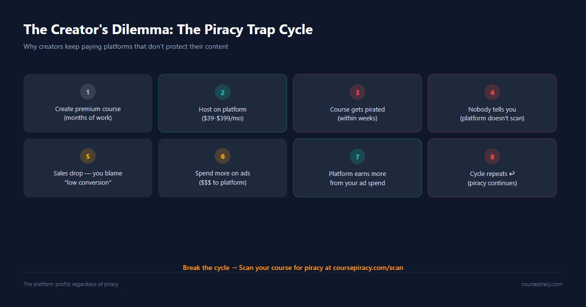 Course platform piracy complicity refers to the structural misalignment between platform business models and creator protection. Platforms earn recurring fees from hosting and payment processing regardless of whether a creator's content is pirated — creating zero financial incentive to invest in anti-piracy infrastructure. This isn't conspiracy; it's economics.