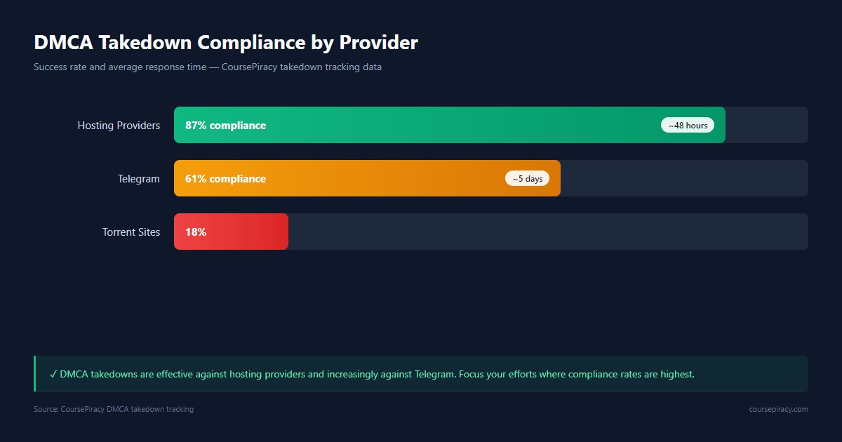 - Torrent sites: 18% compliance (still worth filing — reduces seeders)