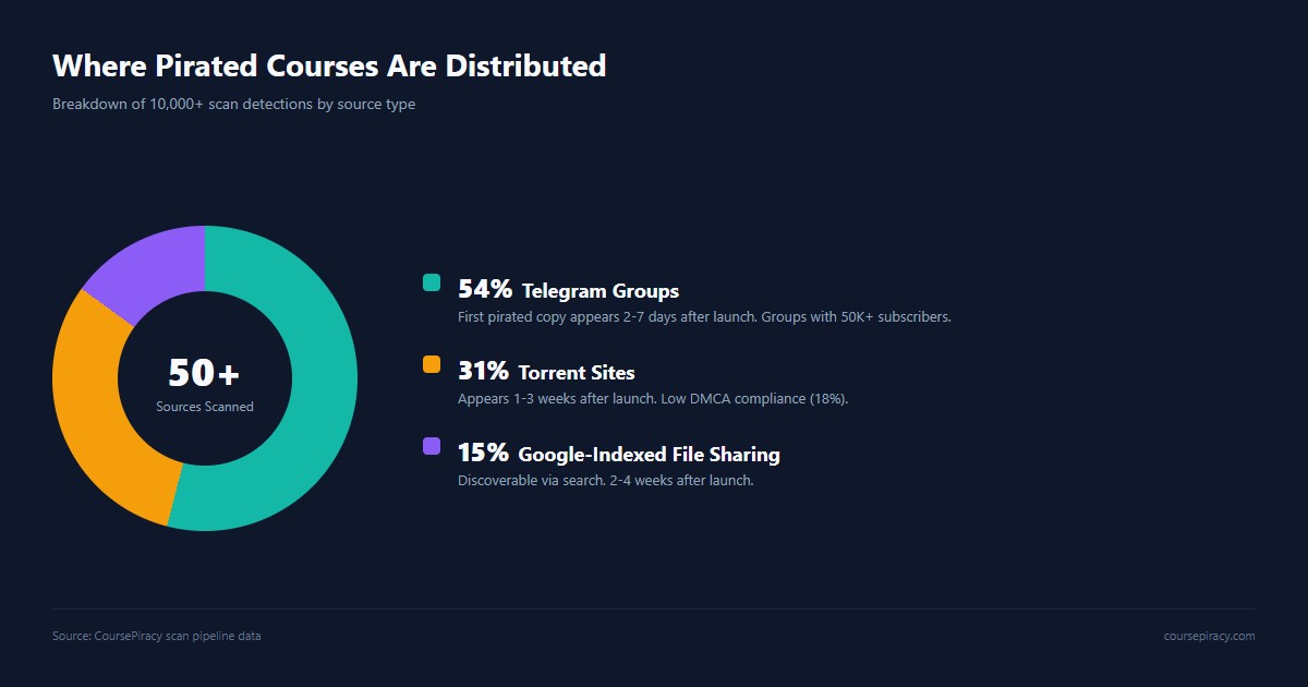 Telegram is the dominant channel — and it's growing. We've tracked Telegram piracy groups with 50,000+ subscribers dedicated entirely to redistributing paid courses. These aren't shadowy corners of the internet. They're easily discoverable with a simple search.