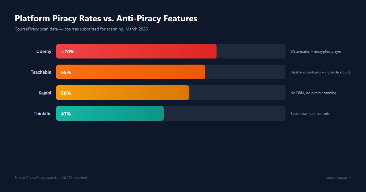 In our scan data, 65% of Teachable courses we've analyzed have at least one pirated copy detected online. Kajabi is at 58%. Thinkific at 47%. These rates reflect courses submitted to CoursePiracy for scanning — creators who suspect piracy — not a random platform sample. Even so, the pattern across platforms is consistent: premium content is routinely pirated.