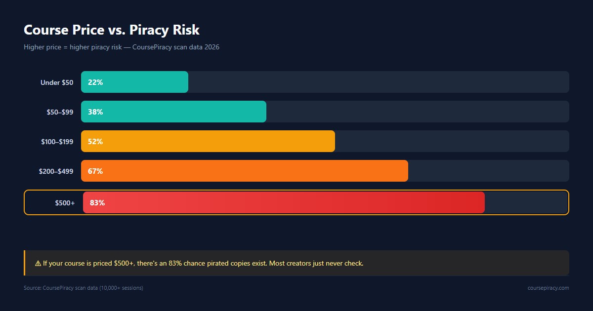 The pattern is clear. If you charge $500+ for your course — which many serious Kajabi and Teachable creators do — you have an 83% chance of finding pirated copies when you actually look. The problem isn't rare. Most premium creators just never look.